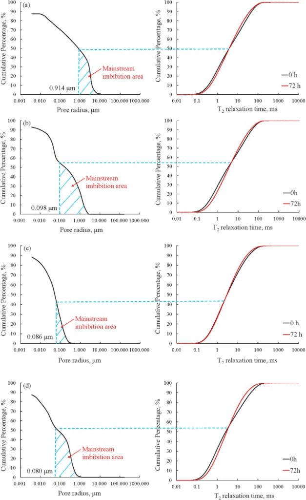 图6中,左图和右图分别来自PCMI和NMR实验。在初始和最终T2累积曲线的任何交叉点上,汞入侵都会发生饱和。这个交叉点与孔隙半径有关,二者连接形成之间的区域(图6中蓝色线条区域)被称作主流浸润区。随着主流浸润面积的增加,最终的石油生产效率也会提高,浸润面积可以被认为是致密砂岩中渗吸效率的一个很好的指标。
