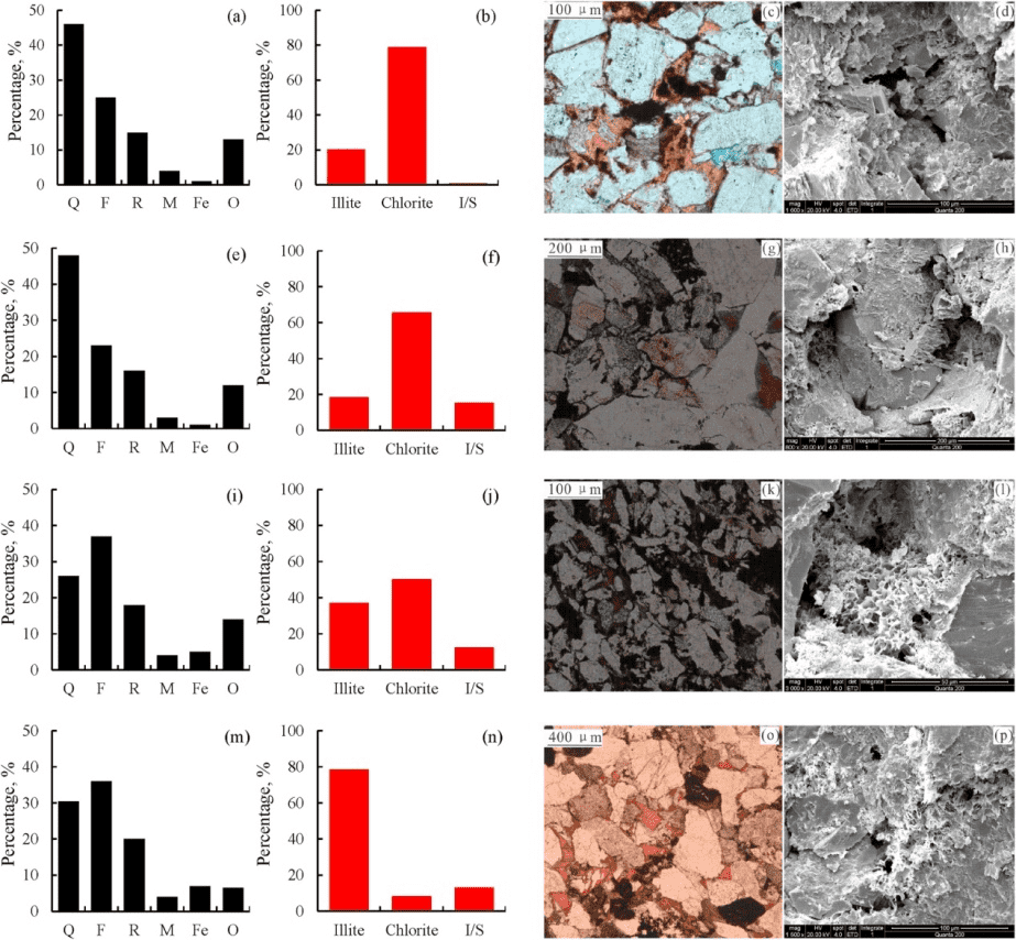 使用TS、SEM和XRD技术获得致密砂岩样品中的矿物组分。对于碎石矿物,会出现相当数量的石英和长石;对于粘土矿物,氯土和伊利石在粘土成分中占主导地位。