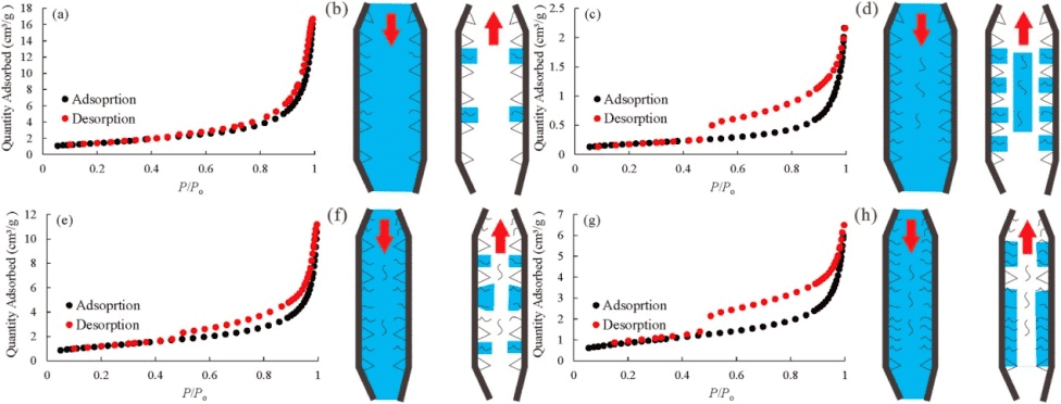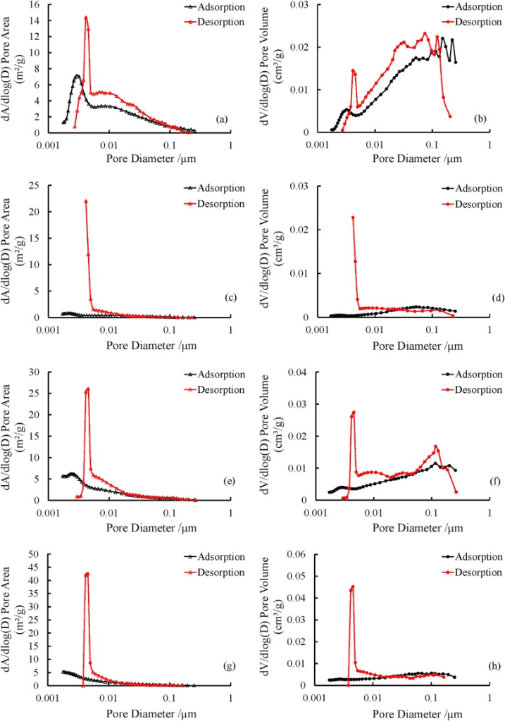图3:通过氮气吸附得到的页岩样品的孔隙面积和孔隙体积分布。X1:a-b,X2:c-d;X3:e-f,X4:g-h