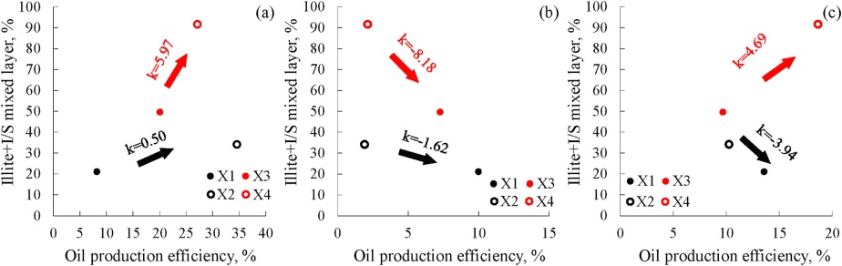 图4:亲水粘土矿物和石油生产效率的拟合(a)早期阶段、(b)中期阶段和(c)后期阶段。k:斜率。