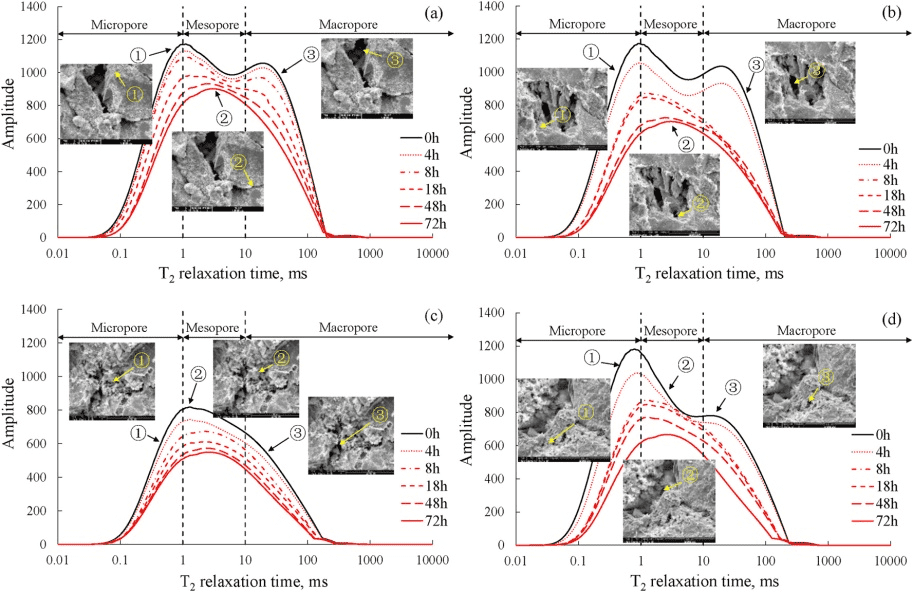 图5:四个样品在不同时间的T2曲线和SEM图像。