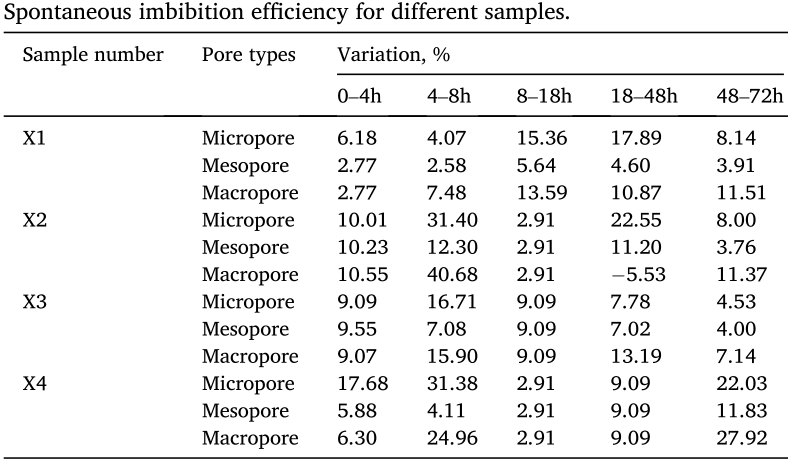1. 亲水矿物的含量对石油开采具有积极影响。随着大孔隙比例的增加,样品会浸入更多的液体。