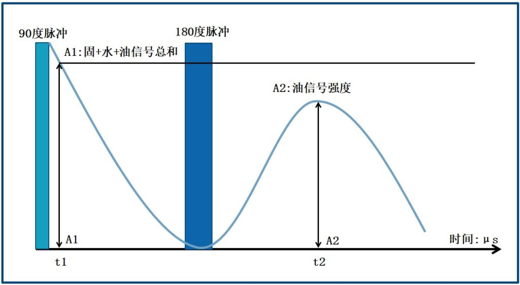 使用自旋回波序列进行测量,图一是自旋回波序列与检测到的核磁信号。在90度射频脉冲后t1处测量了自由感应衰减(FID)NMR信号。此时信号幅度(A1)与样品的两个液相(水分和油分)中的H质子数成正比。180度脉冲后,检测自旋回波信号幅度为A2,此时水的信号已经衰减为0,A2仅为油的信号。
