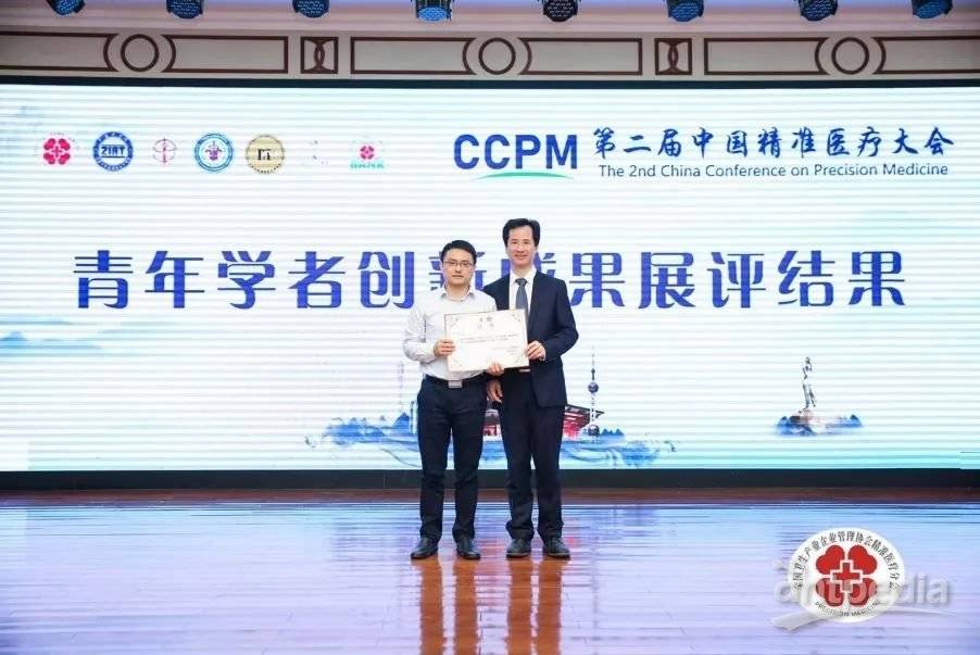 全国卫生产业企业管理协会精准医疗分会副会长葛林虎为青年学者创新成果第一名颁发证书