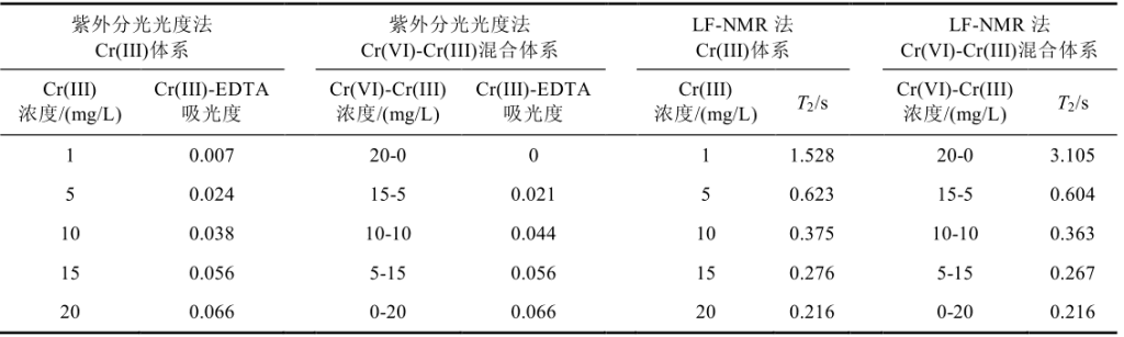 表1 LF-NMR弛豫法和紫外分光光度法分别测得的 Cr(III) 体系和Cr(VI)-Cr(III)混合体系的T2值和吸光度
