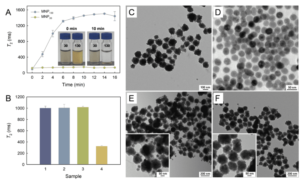 如图1所示,分别在粒径为130 nm和30 nm左右的MNP130和MNP30表面修饰SA和S2,制得SA修饰的MNP130(MNP130-SA)和S2修饰的MNP30(MNP30-S2)探针。当目标物存在时,Cas12a、crRNA和靶标DNA形成三元复合体,并激活trans切割活性以非特异性切割biotin-S1。因此,MNP30-S2无法通过S1和S2之间的碱基互补配对作用结合至MNP130-SA表面,在磁场作用下仍分散在溶液中。反之,大量MNP30-S2结合至MNP130-SA表面,并在磁场作用下被分离。最后,以清液中游离的MNP30-S2为探针,通过横向弛豫时间T2的测定检测沙门氏菌。