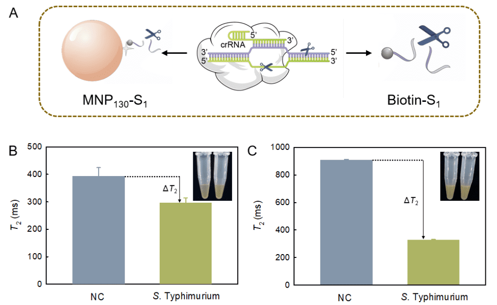 MNPs可作为MRS传感检测中的磁性探针。传统的基于MNPs聚集/分散状态改变的MRS生物传感方法易受样品基质干扰,稳定性较差。基于MNPs数量变化的MRS生物传感器已经得到了较好的发展。但是以上方法需要目标物自身提供位点以控制大小粒径MNPs之间的结合。目标物的表面位点有限且可能发生非特异性结合,因而检测灵敏度会受到影响。为此,本文将CRISPR-Cas12a系统与MRS传感技术相结合,利用CRISPR-Cas12a系统精准控制两种不同粒径MNPs之间的结合,开发基于CRISPR-Cas12a的MRS生物传感器检测沙门氏菌。