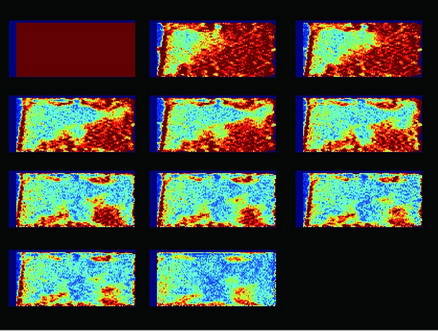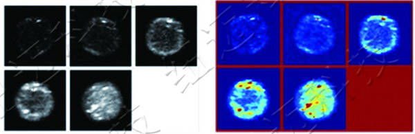 上图中亮的信号代表水分,随着融化的进行,信号逐渐从外部向内部发展,最后完全融化。