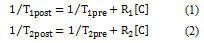 R1、R2为造影剂的弛豫速率,描述了造影剂对组织中T1、T2的影响,[c]为组织中均匀分布的造影剂的浓度。式(1)、(2)T1、T2的倒数同造影剂的浓度呈简单的线性关系。R1、R2依赖于造影剂的结构,对于T1类制剂主要决于造影剂同水分子接近的情况,T2类制剂依赖于磁性物质的浓度。