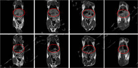 仪器使用小动物核磁共振成像系统,图像为T1加权像横断面、冠状面,采样参数如下:FOV=100mm×100mm, TR=400ms, TE=19ms, 层厚3.5mm, 层间距1mm, 累加次数16, K空间大小192×256。成像结果显示,注射造影剂后,大鼠心脏与肝脏变亮,且随代谢时间延长逐渐变暗。