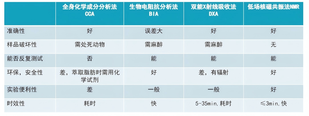 正是在这样的背景下,低场核磁共振技术脱颖而出。相比传统动物脂肪检测方法,如全身化学成分分析法(CCA)、生物电阻抗分析法(BIA)、双能X射线吸收法(DXA)、低场核磁共振技术(NMR),NMR技术以其运行成本低、无创性和可重复性三大优势,成为研究肥胖代谢性疾病病因及肥胖治疗药物评价的理想选择。