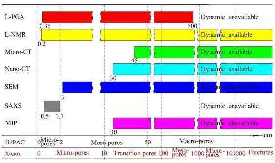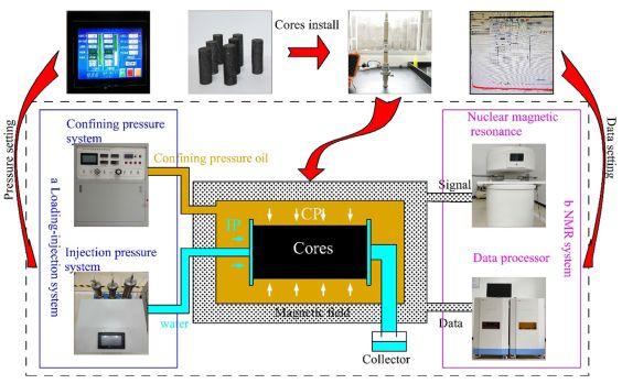 加载-注入核磁共振是研究模拟原位应力和连续注入环境下孔裂隙结构演化的重要技术。煤体孔裂隙结构通常通过气体吸附、压汞、小角x射线散射和扫描电镜来研究,然而这些方法不能对样品施加压力。CT与微CT的分辨率稍显不足。各方法对比如图2。通过核磁共振研究实时孔径分布较为简单。然而单独使用核磁共振观测模拟原位应力和连续注入环境下的孔裂隙结构演化同样不可能的,因此本文开发了加载-注入核磁共振系统,如图3。煤芯最大直径和长度分别为25.4mm和60mm。系统通过使用氟油对径向施加围压,最大围压25MPa;最高温度150℃;液体或气体通过轴向注入煤芯。