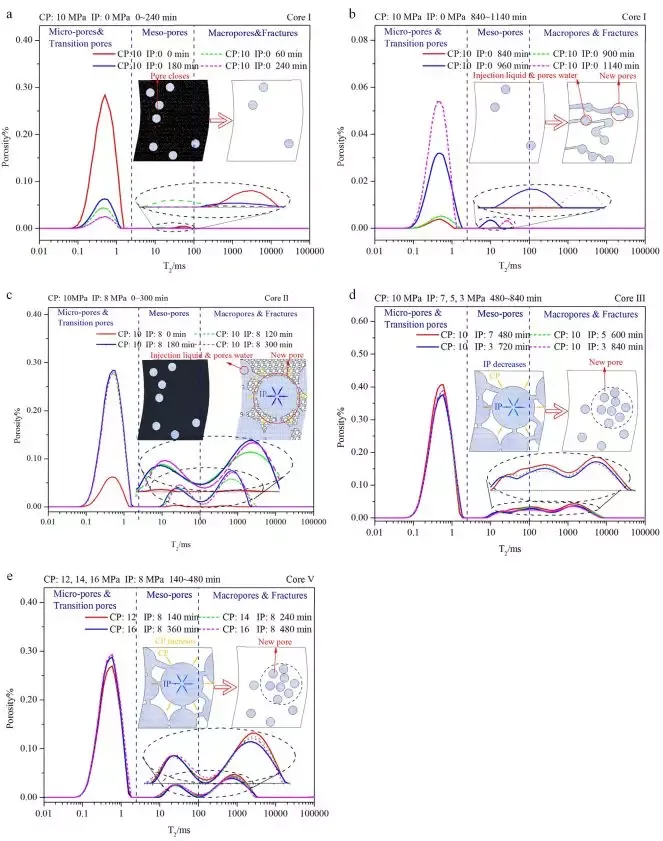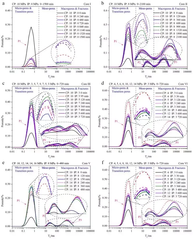 不同孔径及类型的孔裂隙演化不同。在恒定或增加围压条件下,总孔隙度先减小后增加。在减小注入压力或增加围压条件下,中孔、大孔-裂隙数量减小而微孔-过渡孔数量增加。如图7a所示,在恒定围压或注入压力条件下,煤芯I T2谱在0-240min范围减小,总孔隙度减小,煤体压缩;在840-1140min范围T2谱增加,总孔隙度增加(图7-b)。