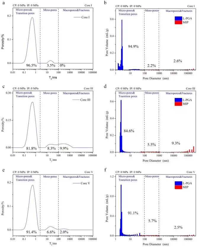 对三种加载模式下的样本卸去围压和注入压力后进行核磁共振,气体吸附和压汞测试。其中,煤芯I来自固定围压和注入压力模式,煤芯III来自固定围压,改变注入压力模式;煤芯V来自改变围压,固定注入压力模式。气体吸附的测试孔径范围为0.35-500nm,压汞的测孔范围>30nm,将两者结合可以有更广的孔径分布范围。