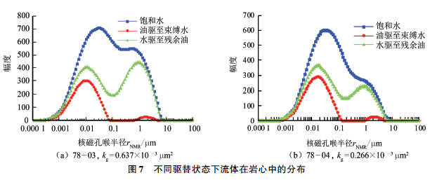 下图为不同驱替状态下水相在岩心孔隙中的分布。其中,束缚水状态的曲线代表油驱后不可流动的水在孔隙中的分布,饱和水与束缚水状态两条曲线之间、残余油与束缚水状态两条曲线之间以及饱和水与残余油状态两条曲线之间分别为可动流体、可动油和残余油在孔隙中的分布。
