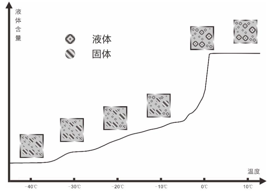 核磁共振冷冻测孔法的实质是利用流体固、液态核磁共振弛豫性质的差异来表征孔隙结构特征。在实际测量过程中,首先将某种液体(一般为润湿性液体)饱和填充于待测的多孔固体材料中,通过仪器配备的冷却装置进行变温操作,测量相应相变过程的液体变化量,从而获得熔化(或凝固)曲线,分析孔隙的相关信息。