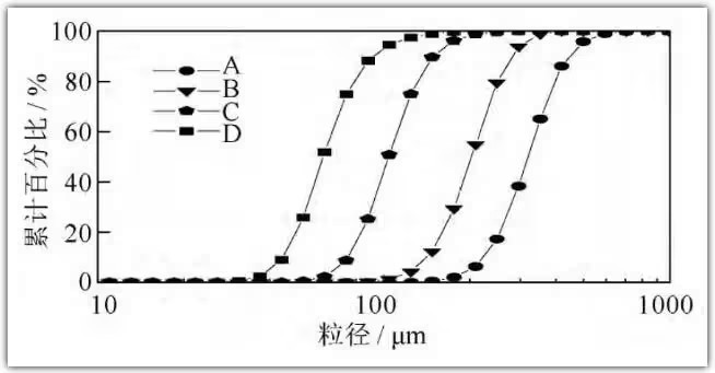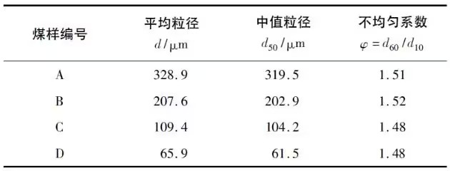 试验选用煤粉作为原材料,经50、70、100、200、270目筛网筛分得到样品,然后经水洗筛分,烘干后得到颗粒粒径相对单一的A、B、C、D四种煤粉,各自的颗粒粒径分布见图1,颗粒粒径及不均匀系数见图2。