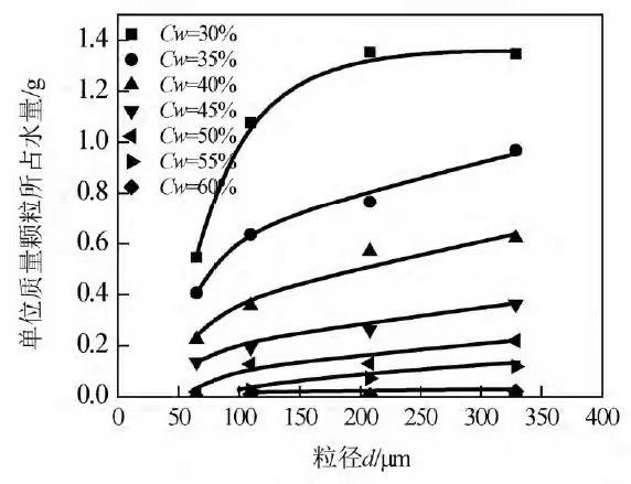 图6b为不同浓度下粒径与自由水量的关系,可以看出,当浓度小于55%时,颗粒粒径越大,单位质量颗粒所含的自由水量越多;当浓度大于55%时,自由水量变化不大,接近于0;这是由于颗粒粒径越小,其吸附能力和团聚作用也就越强,更多的水分以间隙水和吸附水的状态存在。