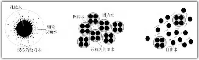 水煤浆中存在三种不同状态的水分,分别为颗粒表面的吸附水、颗粒间的间隙水、自由水,三种水分由于其物理化学状态不同,自由活动能力存在本质差异。具体如下图所示。