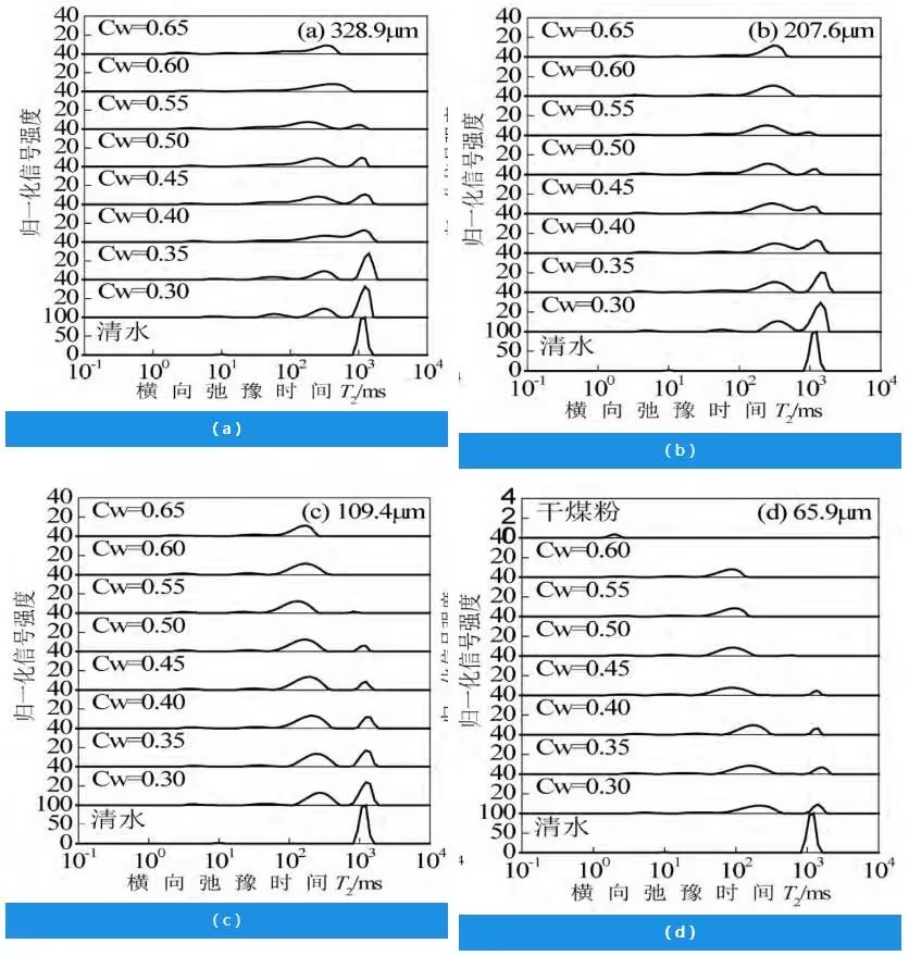 不同浓度、不同粒径的水煤浆反演后的弛豫信号如下图3所示。