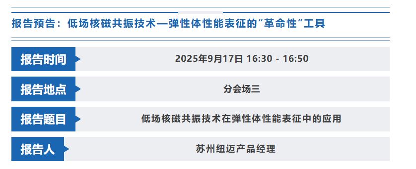 2025年9月17日下午16:30-16:50,分会场三,苏州米兰网期待与您相遇,共同探讨低场核磁共振技术的无限可能,携手推动弹性体材料迈向更高性能、更绿色智能的未来!