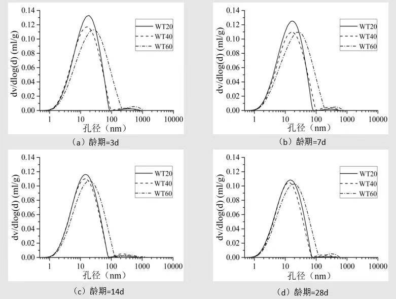 图 3 不同养护温度的补偿收缩水泥浆体随龄期变化的孔径分布图