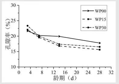 SAP的饱水掺入增大了浆体实际水灰比,浆体在前3天的孔径和孔隙率都 大于不掺SAP的CaO补偿收缩水泥浆体,7天后,当浆体内的自干燥作用明显时,SAP的释水作用使得浆体内未水化的水泥颗粒继续发生反应,水化产物的填充作用使得浆体的孔径被细化,孔隙率减小。