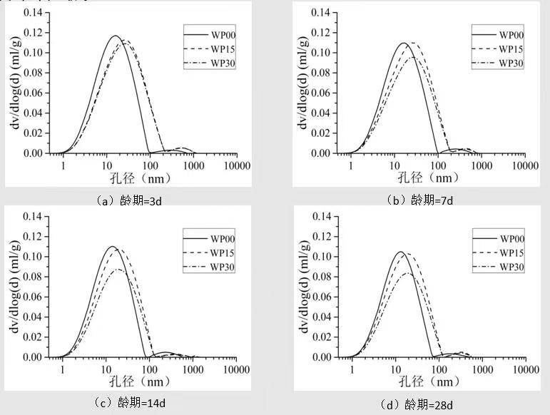 在前3天,SAP掺量越大,凝胶孔最几孔径越大,凝胶孔数量越多,7天后, SAP掺量越大,凝胶孔最几孔径下降变快并小于不掺SAP的浆体。对于毛细孔,次峰峰值随着SAP的增加而增加。