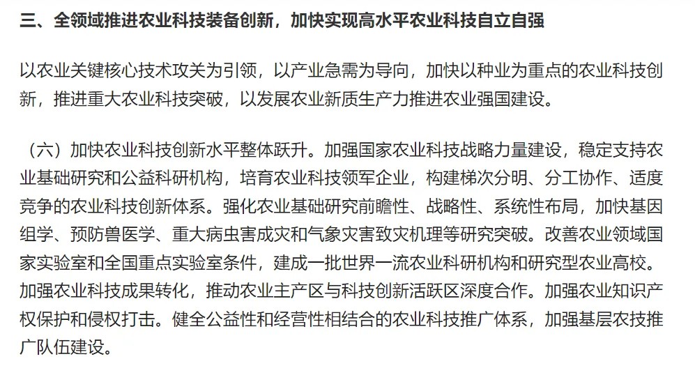 近日,中共中央、国务院印发的《加快建设农业强国规划(2024-2035 年)》在农业领域引发广泛关注。该规划明确指出,要全领域推进农业科技装备创新,将加快实现高水平农业科技自立自强作为核心任务。