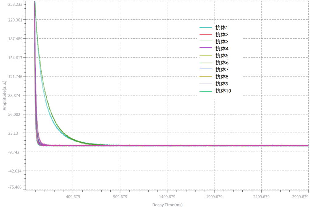 测试2批次十个mAb单抗样品的T2弛豫时间,可以对样品进行快速的分类和筛选,并且可以明显区分不同的抗体样品。
