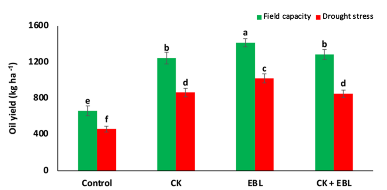 激素叶面喷施的作用:在两种灌溉水平下,叶面喷施 CK、EBL 和 CK+EBL 均能显著提高油菜的油产量。其中,EBL 处理的效果最为显著,在田间持水量和干旱胁迫下,EBL 处理的油菜油产量相比对照均有大幅度增加,说明 EBL 对提高油菜油产量有积极作用。在干旱胁迫下,EBL 处理后的油菜油产量下降幅度相对其他处理较小,这进一步表明 EBL 在缓解干旱胁迫对油菜油产量的负面影响方面效果突出。