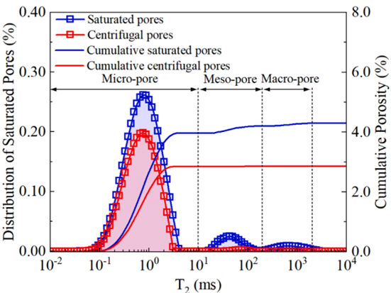 该研究使用低场核磁共振技术,研究了脉冲加载水力压裂后损伤煤样的孔隙结构,获取弛豫谱图和孔隙度分布信息,有以下结论:图二表明煤的孔隙度分布随T2的变化而变化。根据饱和孔隙的累积曲线,微孔的孔隙率约为3.96%,总孔隙率为4.30%。煤样的峰值饱和孔隙度位于T2=0.76ms处。饱和孔隙率包括被游离水和吸附水占据的孔隙。通常可用通过离心法去除游离水来测量吸附的孔隙率。饱和孔隙和离心孔隙的覆盖面积之差代表自由孔隙。从累积孔隙率曲线可以看出,吸附孔隙的孔隙率为2.86%,自由孔隙的孔隙率为1.44%。