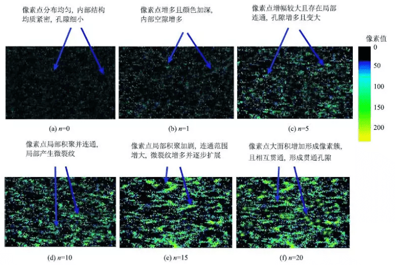 从图中可以看出,随着干湿循环实验的进行,岩石内部孔隙逐渐增多,孔隙尺寸增大,形成贯通的小裂缝并逐渐扩展,不同循环次数作用后的MRI内部结构变化与SEM微观结构变化相似(图5)。