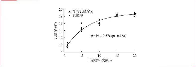 由于T2谱图的总面积代表岩石内部的总孔隙体积,而谱面积的大小与岩石中所含流体的多少成正比,即与岩石中孔隙率的大小相关。通过求取平均的谱面积与循环次数的变化规律,即可求得孔隙率与干湿循环次数之间的相关关系(图3),从图中可以看出,孔隙率与干湿循环次数呈现出定量的指数关系。