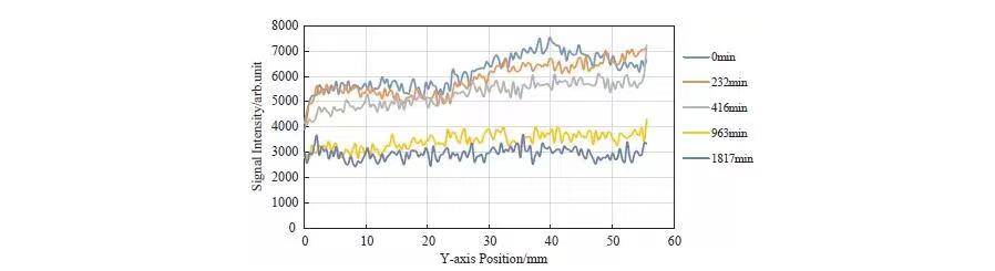 图6进一步展现了沿着Y轴的核磁信号强度分布。随着水合物形成,信号幅度不论是从绝对幅度来说还是波动幅度来说都逐渐减小。在第1800分钟后获得的信号幅值反映了岩心内部较均一的束缚水状态,这与MRI成像结果是十分吻合的。