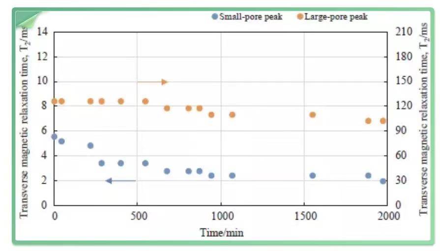 图10展示了在图8中核磁谱的两个峰(分别对应与大孔和小孔)峰顶点的移动规律,可见不论大孔还是小孔,核磁谱峰都呈现一定的向左(更小的弛豫时间)移动了,利用这一点可以推测水合物在孔隙中的合成位置。