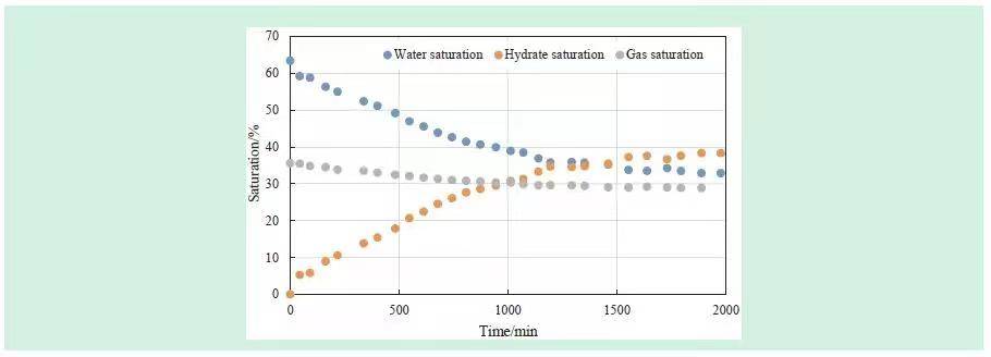 图4为利用核磁T2谱计算出的在水合物生成过程中水的饱和度,甲烷气饱和度和水合物饱和度随时间的变化。本文选用的过量气体法即确保水合物生成过程中甲烷气的供给是足够的,那么液态水的减少量就对应于固体水合物的生成量。
