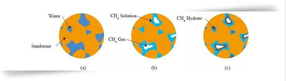 图11为采用过量气体法在含水砂岩中合成甲烷水合物的示意图。当甲烷分子被注入岩心中后首先存在于大孔隙中,之后依靠溶解扩散作用进入小孔中,最终在大孔和小孔的孔隙中央部位均有水合物的合成。
