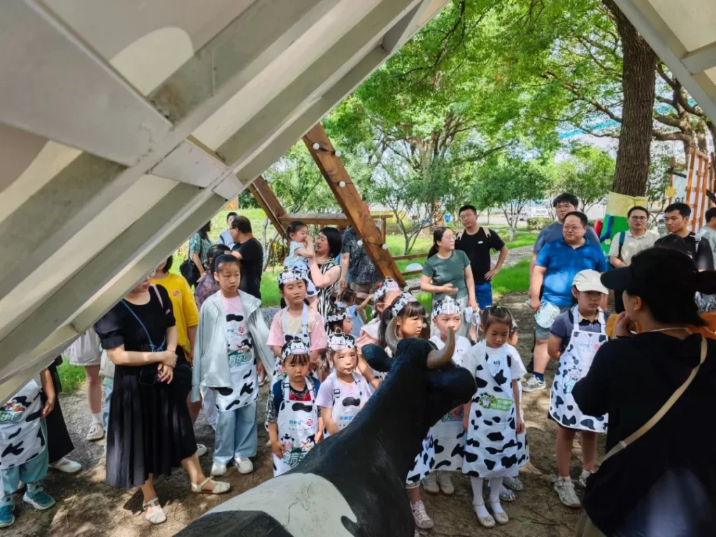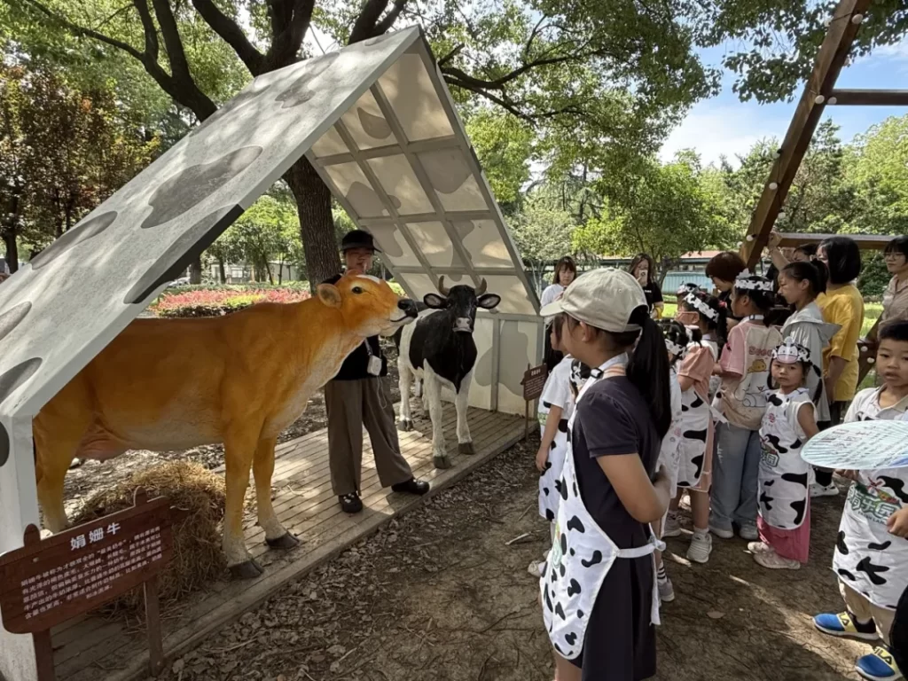 活动伊始,孩子们如同欢快的小鹿,来到了充满田园气息的“生态仿真牧场”。在这里,他们瞪大了好奇的眼睛,认真聆听工作人员讲解不同品种奶牛的知识,了解这些“产奶小能手”们的生活习性。看着模拟奶牛,听着关于它们的故事,孩子们对牛奶的来源有了更直观的认识,小脑袋里装满了新奇的知识。