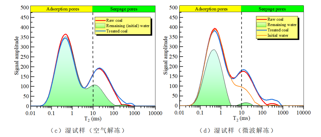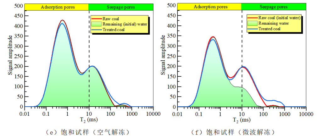 作者在实验前后和处理过程利用低场核磁技术测定了煤试样的T2谱曲线。图二绘制了煤试样的T2谱曲线。冻融处理后试样(处理煤)T2曲线右移,第二峰振幅增大。这些变化说明处理后煤孔隙的大小和数量都有所增加。此外,微波解冻对试样T2谱的增强作用比空气解冻更明显。这表明与空气解冻相比微波解冻对煤孔隙结构的破坏更为有效。煤样孔隙分为微孔、中孔和大孔(或裂纹),对应的T2大小范围分别为