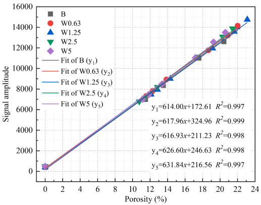 T2谱峰面积与试样含水量呈正相关,不考虑试样中闭孔影响,则加压饱水试样含水体积即是孔隙体积,通过对已知含水量或孔隙度的样品进行核磁共振测试,可以得到峰面积与孔隙度之间的线性关系(如图二所示)。