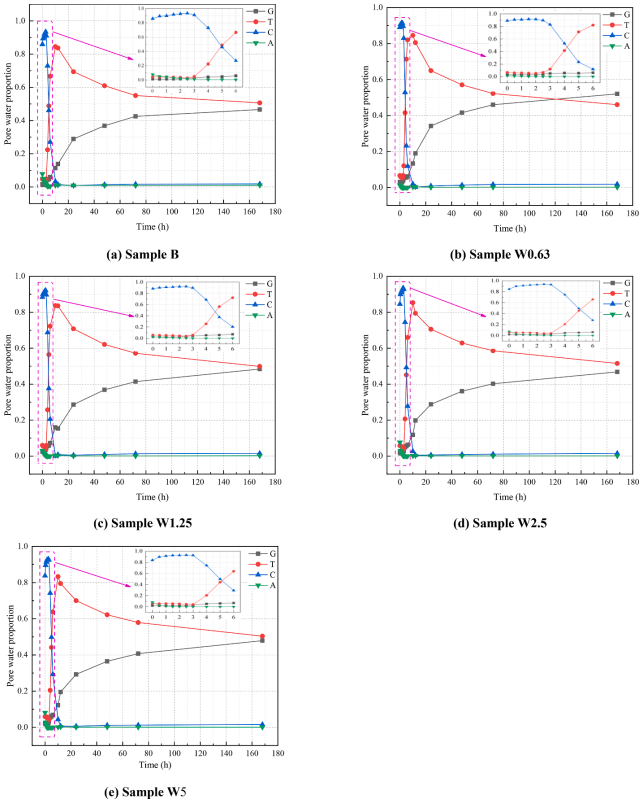 1、随着水化程度的提高,孔隙内表面发生水化反应生成C-S-H和CH,消耗部分水分,导致孔径减小。部分毛细孔和空隙转化为过渡孔,部分转化为凝胶孔。因此,过渡孔在孔隙变化和水输运过程中起着中介作用。