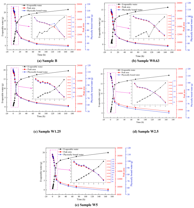图五 蒸发水、物理结合水和峰面积随水化时间的变化