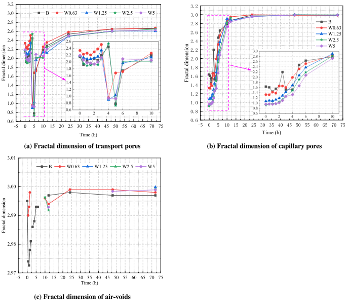 毛细孔在水化早期不具有分形特征,但其分形维数随水化时间增加逐渐增大,在前0-1.5 h变化缓慢,在2-10 h迅速增大,24 h后分形维数大于2.9,并保持不变。W0.63的毛细孔分形维数在水化4 h后具有分形特征,而W1.25、B、W2.5和W5的毛细孔分形维数则是在6 h后具有分形特征,机制砂的分形维数与AS负相关。标准砂的分形维数变化在6 h内最为复杂,分形维数反复增减,AS组成越复杂,水化早期的分形维数变化越复杂。气孔虽然一直具有分形特征,且分形维数在水化早前快速增加,约水化10h后具后趋于稳定,基本保持不变,但是气孔分形维数并不连续。