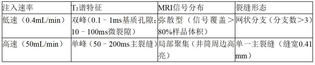 低速区:NMR显示流体渗透至试样边缘(蓝色区域>80%),微CT证实多分支裂缝(分支数>3);