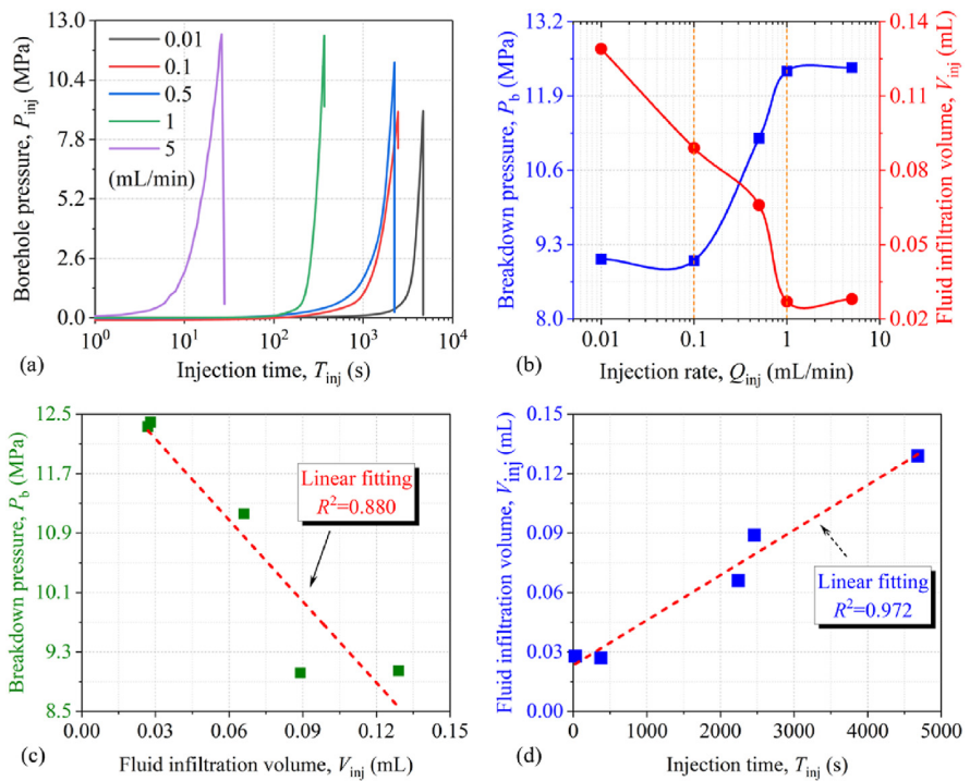 低速区(Qinj < 5 mL/min):Pb从38.2 MPa降至27.3 MPa(降幅28.6%),因流体充分渗透弱化岩石(水化作用)。