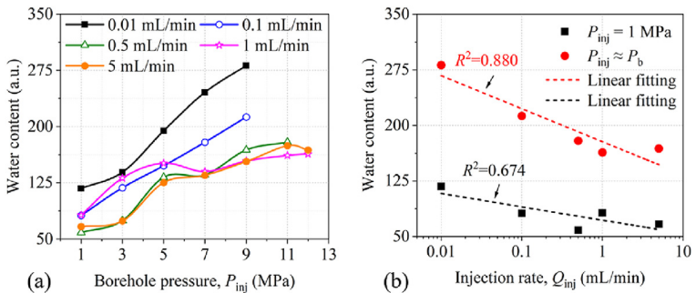 随井筒压力P上升,水含量线性增长,但不同Qinj下斜率差异显著: