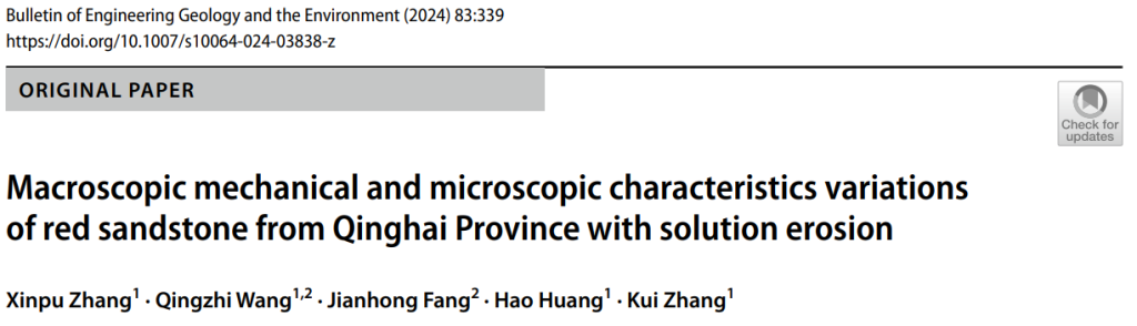 [1] Zhang X, Wang Q, Fang J, et al. Macroscopic mechanical and microscopic characteristics variations of red sandstone from Qinghai Province with solution erosion[J]. Bulletin of Engineering Geology and the Environment, 2024, 83(8):1-18.DOI:10.1007/s10064-024-03838-z.