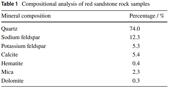样品采集:采集红砂岩样品,经风干、粉碎至粒径1-2 mm,制备成标准尺寸的圆柱体(直径50 mm,高50 mm),用于力学测试。