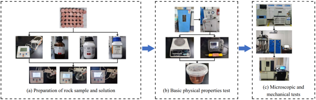 该研究的背景源于水岩相互作用(water-rock interaction)在地质工程、环境科学及工程灾害防治中的重要性。水岩相互作用是岩石在自然或人为环境中(如酸性、碱性或盐类溶液)发生物理和化学变化的过程,其影响岩石的力学性能、微观结构及稳定性。例如,在酸性环境中,岩石可能溶解或发生离子交换;在碱性环境中,可能促进矿物溶解或沉淀;盐类溶液可能加速水岩反应,导致岩石结构破坏或稳定性降低。这些过程在工程(如隧道、大坝、边坡)和环境(如酸雨、盐碱地)中具有重要影响。